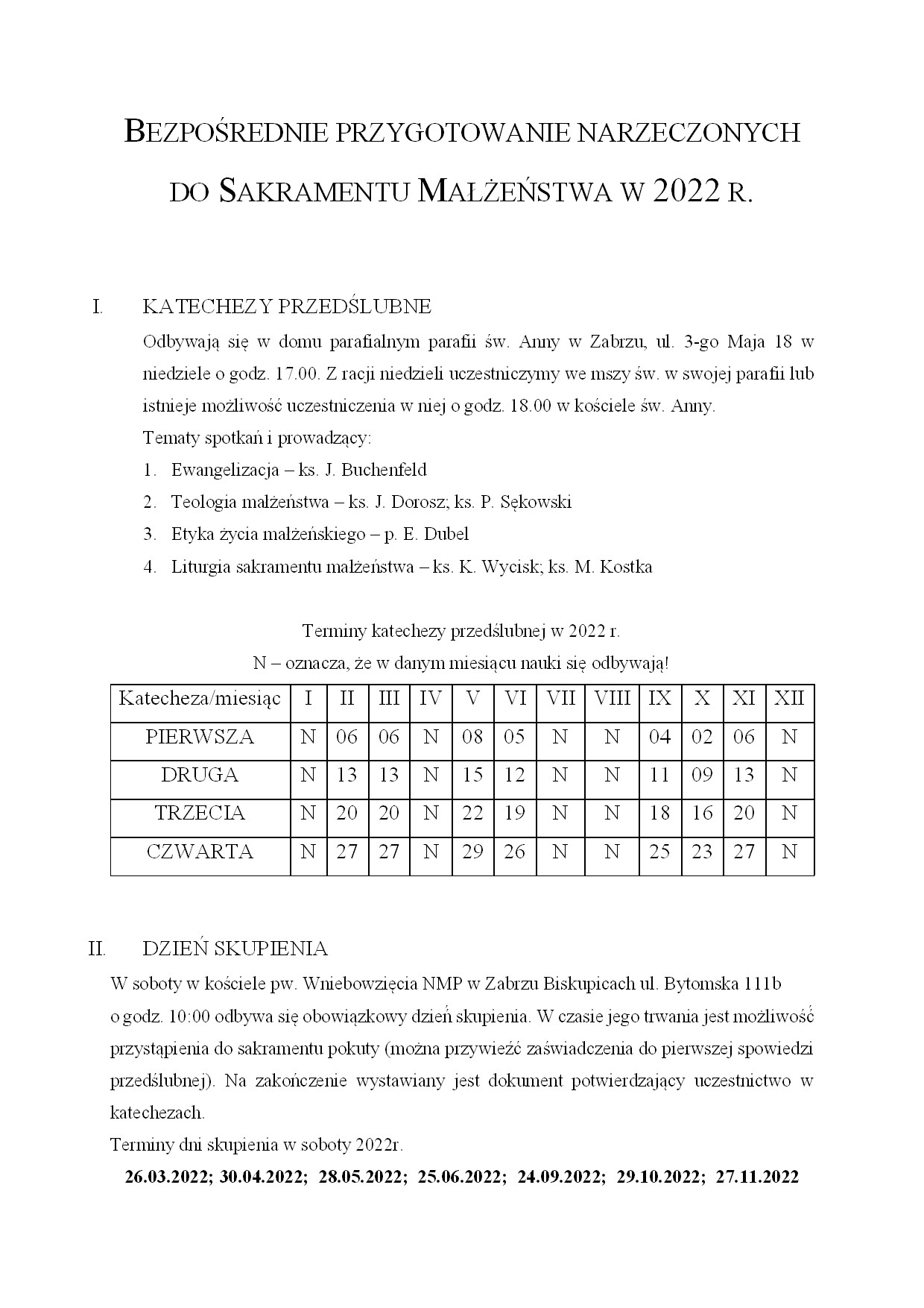 Nauki przedmałżeńskie dla narzeczonych odbywają się w parafii św. Anny w Zabrzu według planu. Nauk nie ma w lipcu i sierpniu. Na spotkaniach uczestnicy otrzymują zaświadczenia, stąd nie ma potrzeby zgłaszania się po kartki uczestnictwa w swojej parafii.