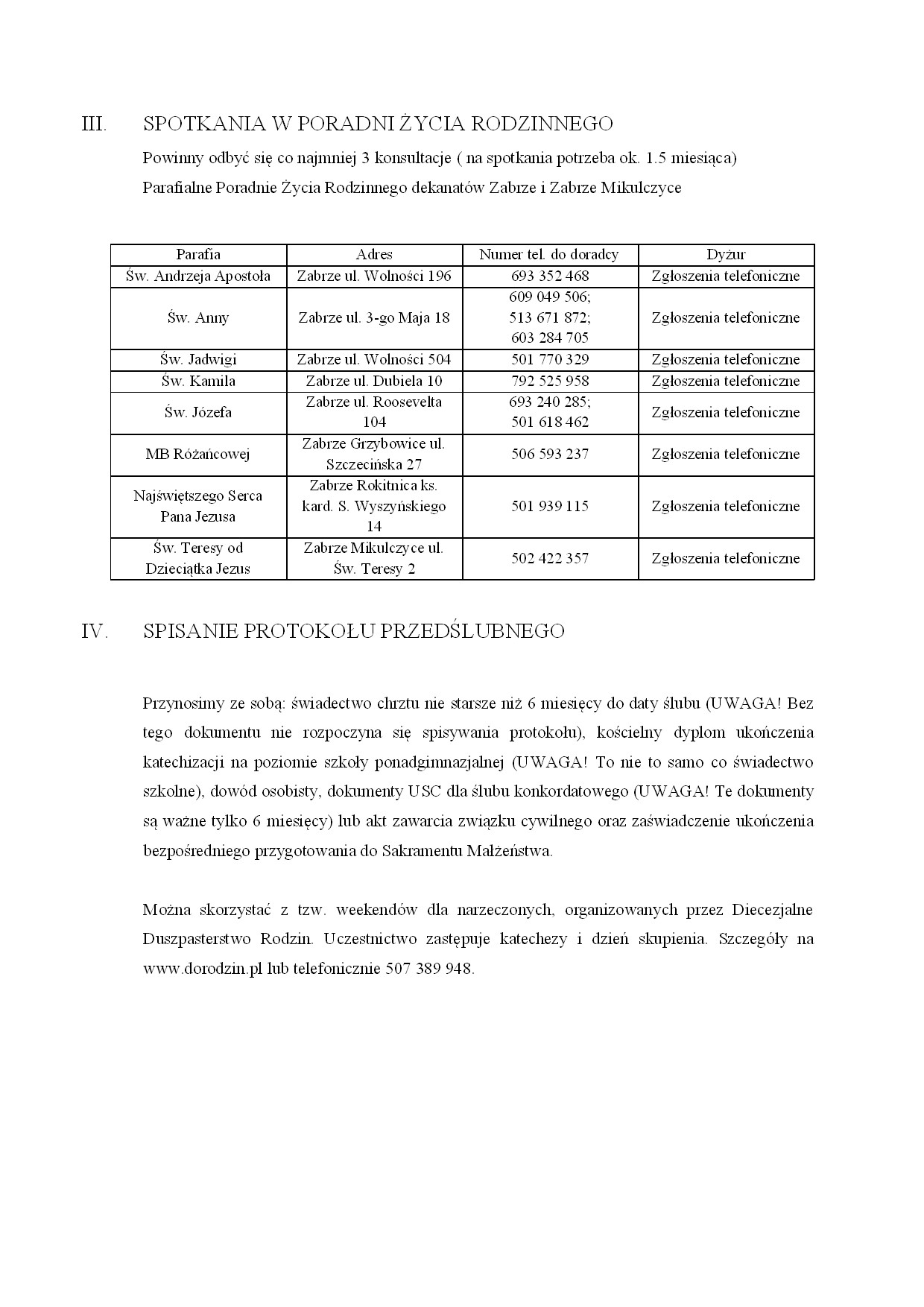 Należy odbyć trzy spotkania. Informacji udziela miejscowy duszpasterz przy spotkaniu w kancelarii parafialnej.