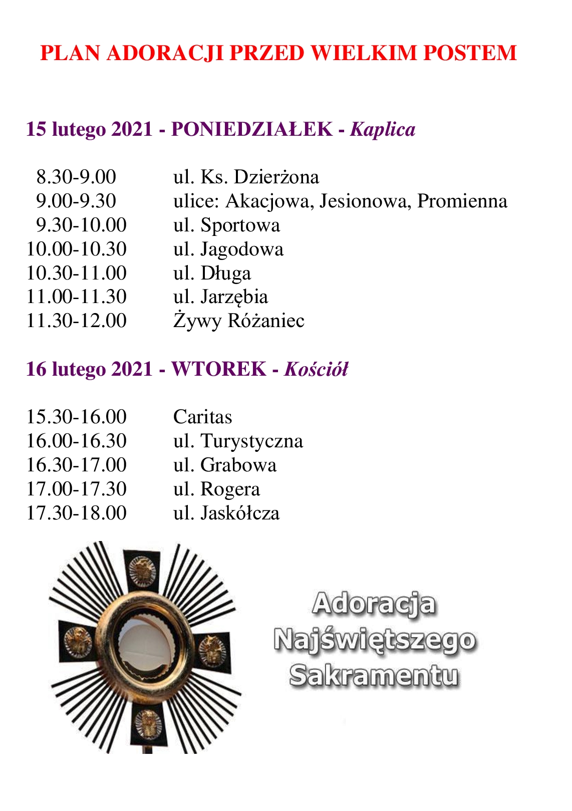 Jeżeli przepisy państwowe pozwolą, to Pierwsza Komunia św. odbędzie się 25 kwietnia na Mszy św. o godz. 9.30 dla dzieci z klasy 3a, a o godz. 11.15 dla dzieci z klas 3b i 3c oraz zapisanych dzieci z innych szkół. Jeżeli pewnym rodzicom zależy, aby dzieci przystąpiły do Pierwszej Komunii Św. na Mszy o 9.30 to proszę nam to zgłosić do przyszłej niedzieli (07 marca 2021 r.). Ostatnie obowiązkowe spotkanie z ważnymi informacjami dla rodziców (prosimy, aby byli obecni oboje rodzice/opiekunowie) odbędzie się 22 marca o godz. 19.00 w naszym kościele.
